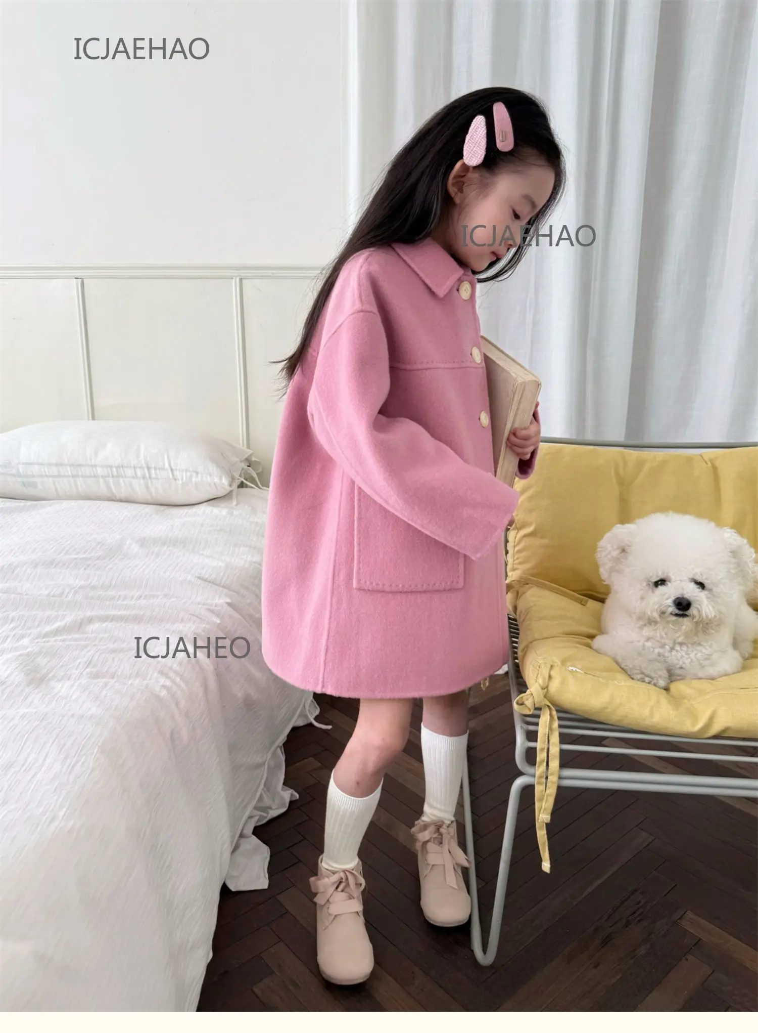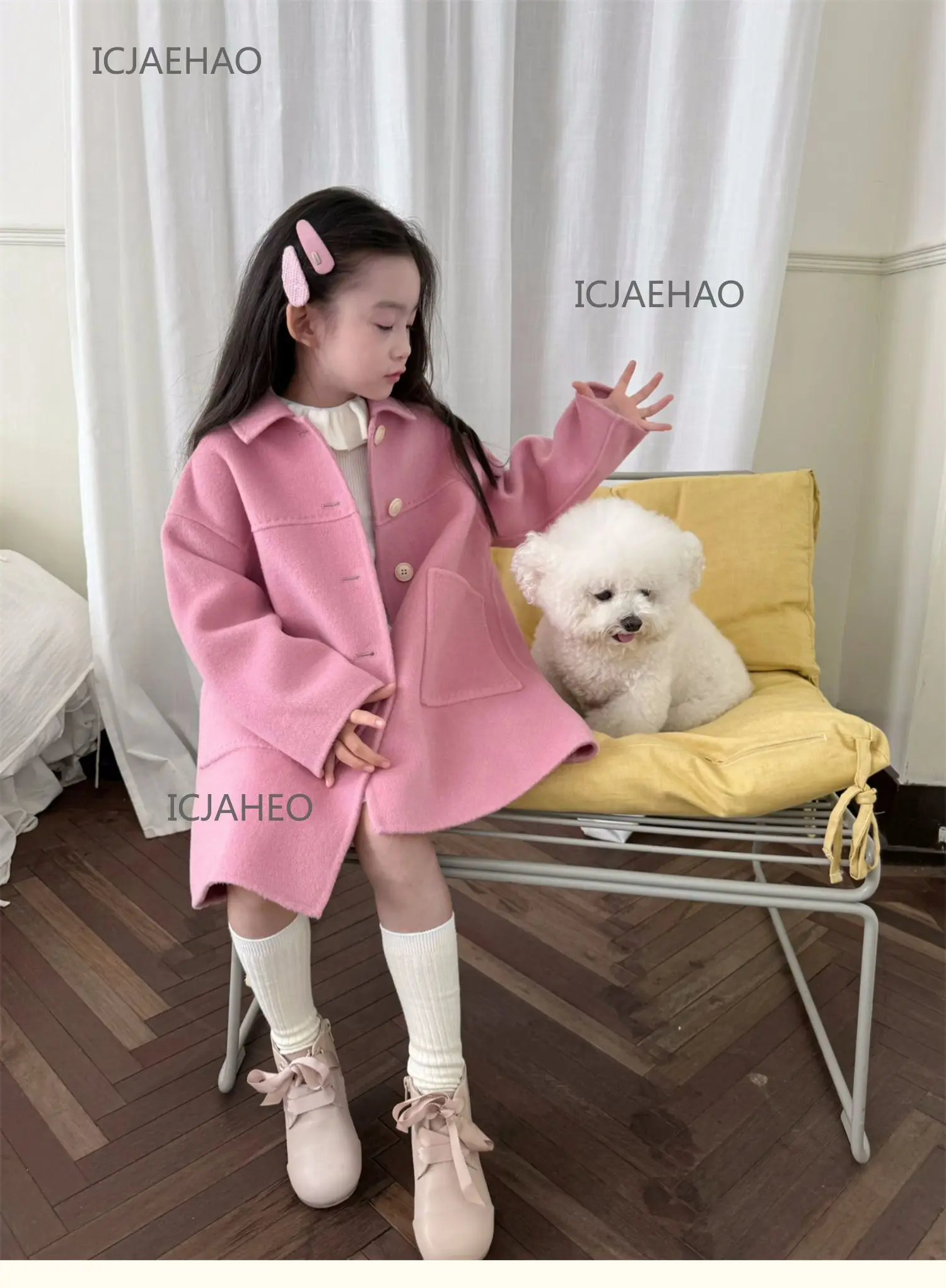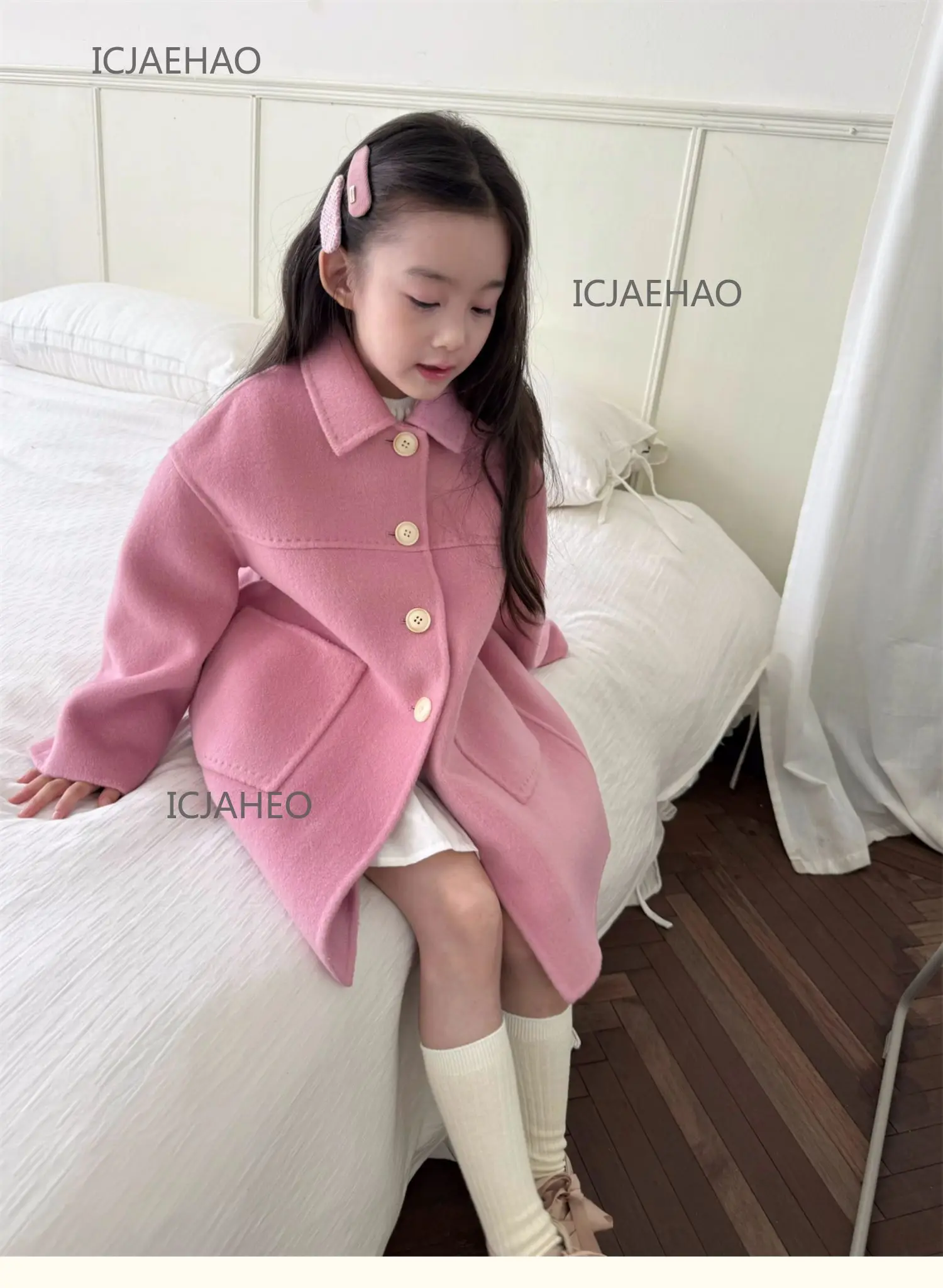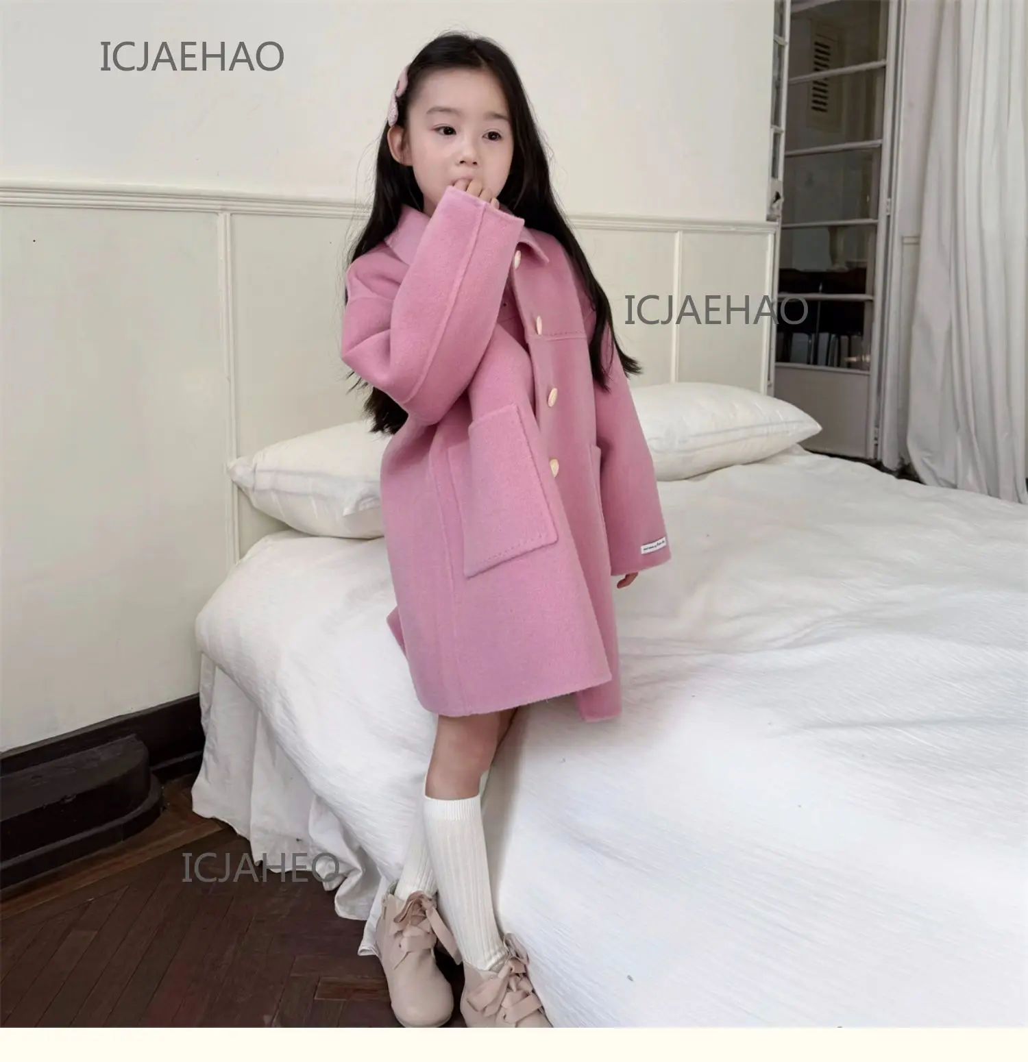Teen Girl Clothes Children Wool Double Faced Girls Peach Pink Coat Costume Handmade Cute Matching Winter Kids Outerwear Clothes