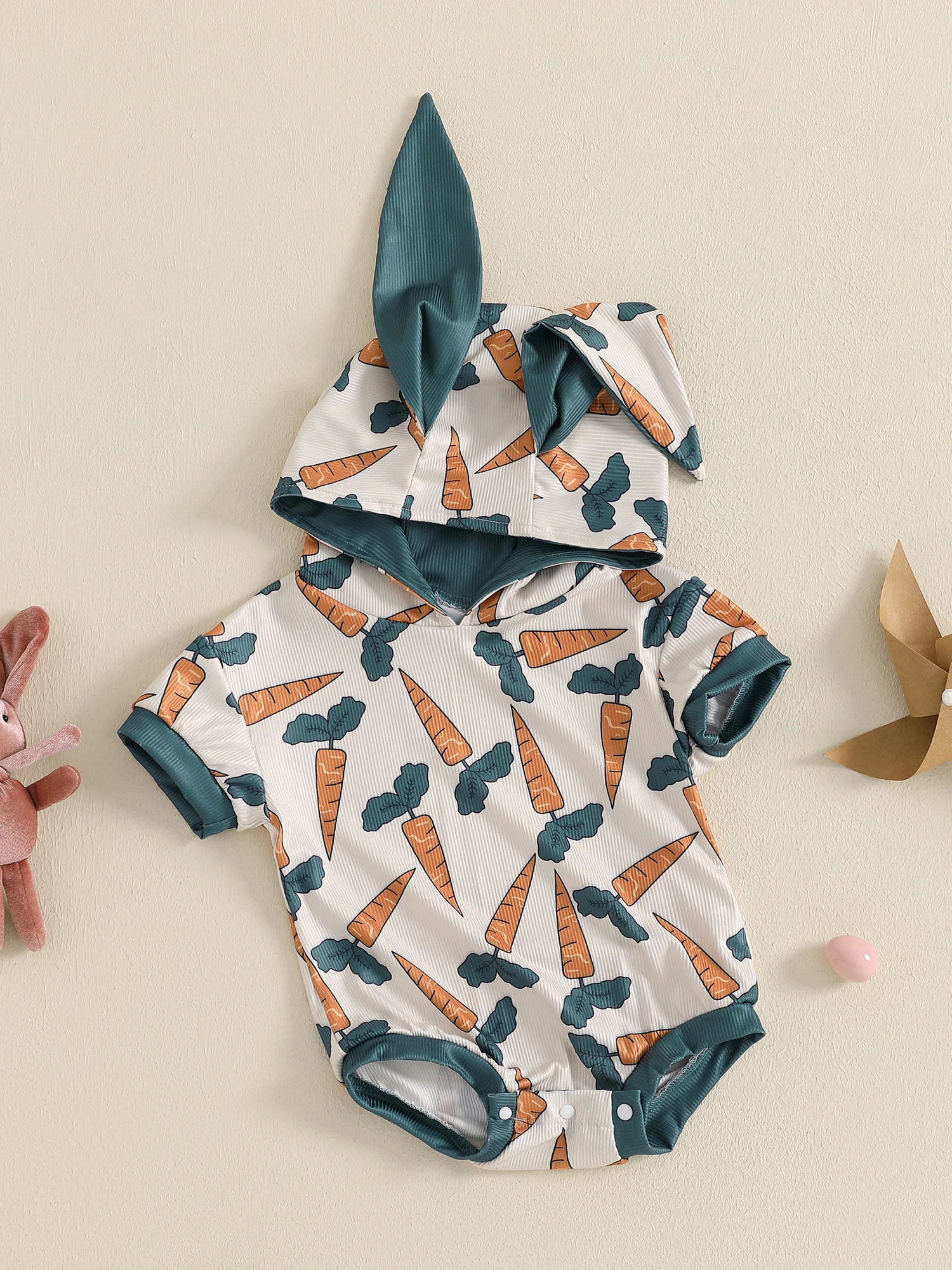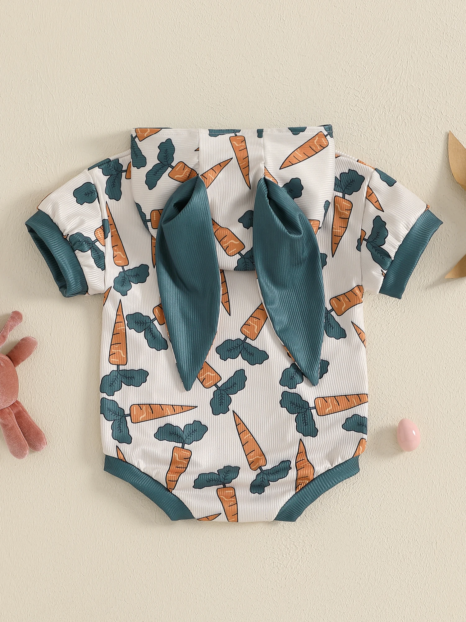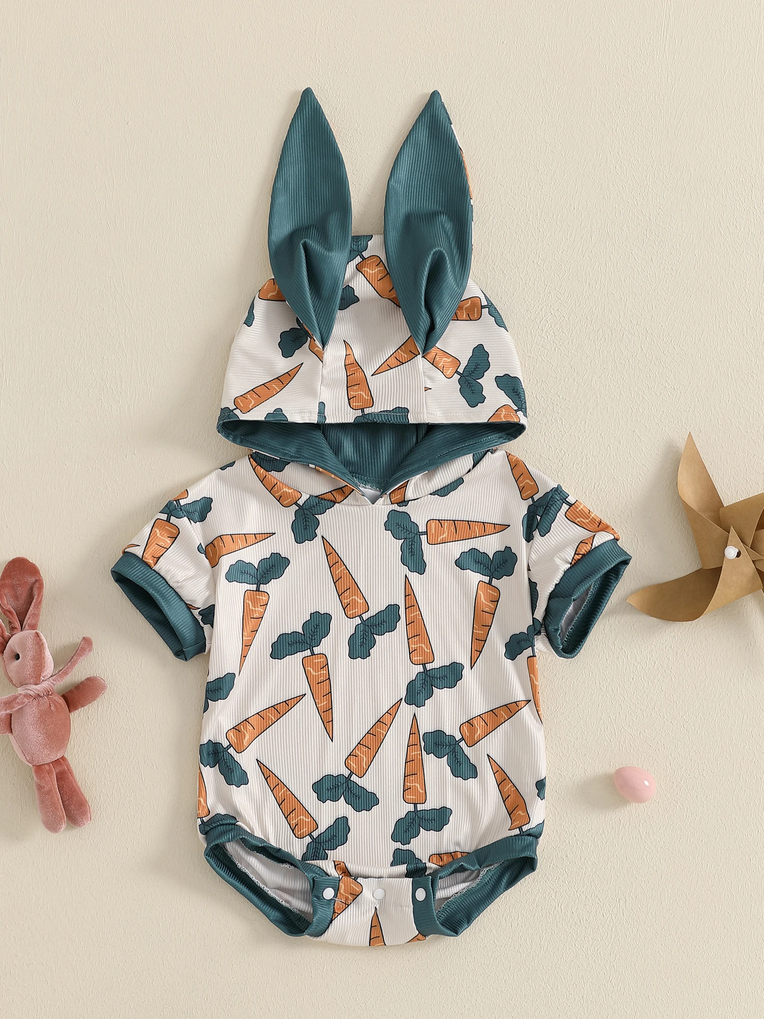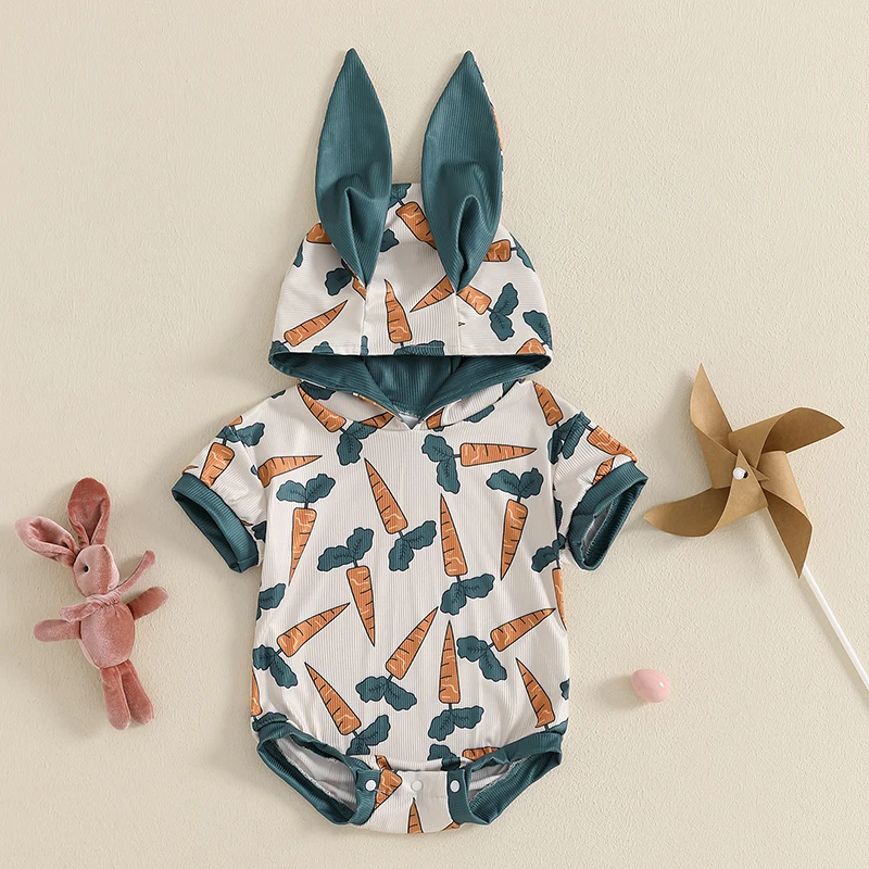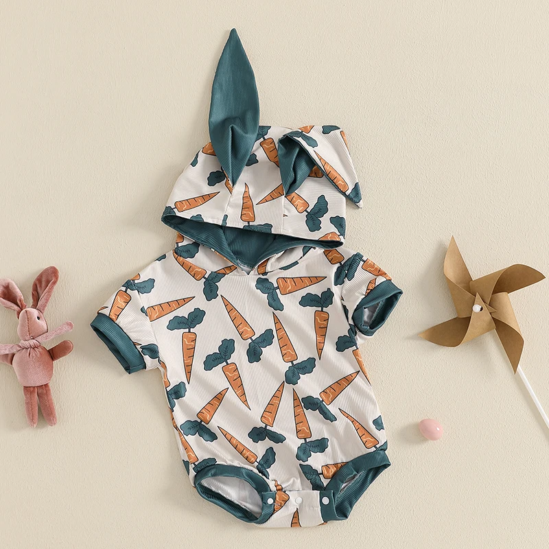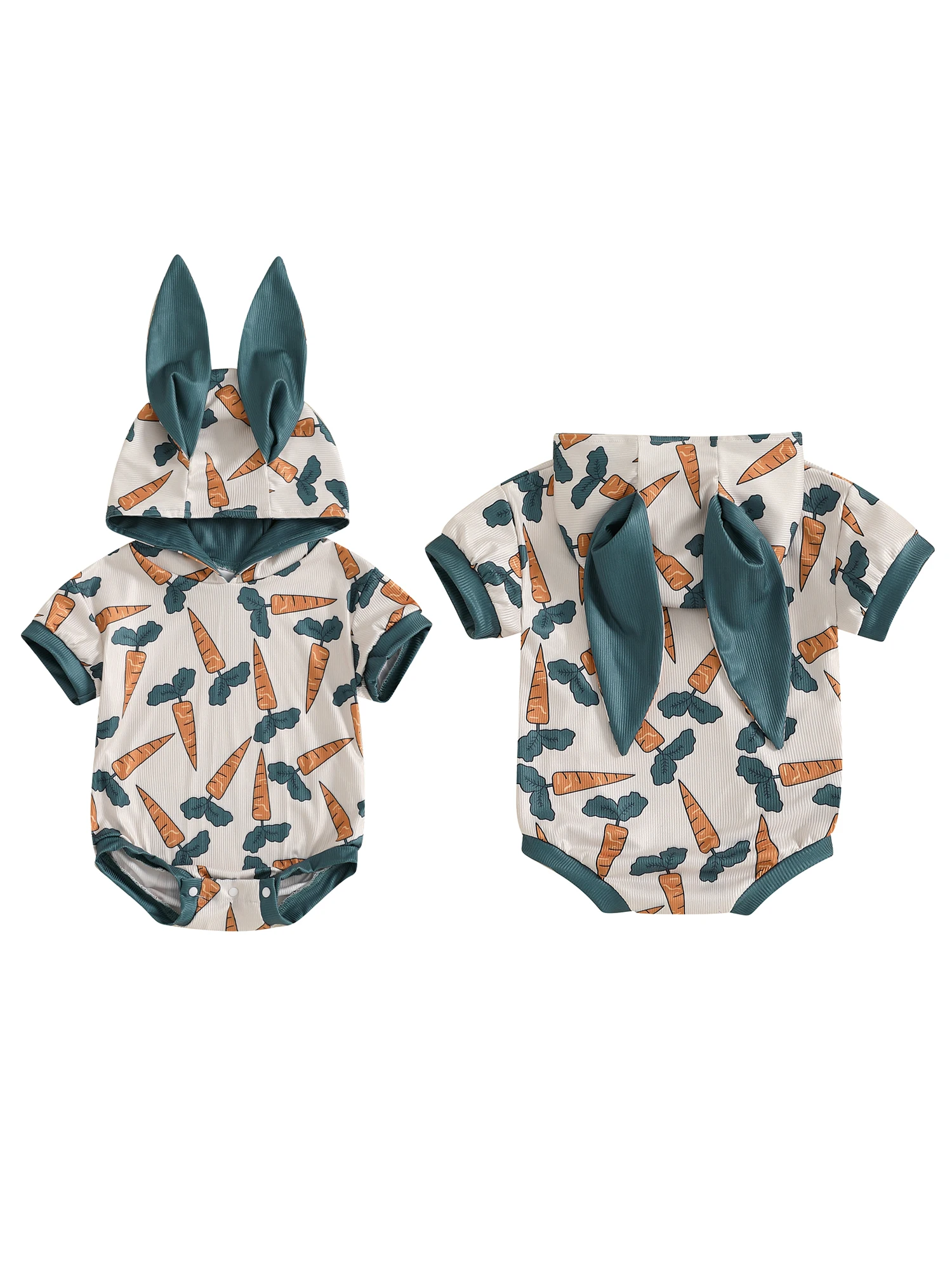 Baby Romper, Short Sleeve Bunny Ears Hooded Carrot Print Summer Bodysuit Easter Clothes for Girls Boys