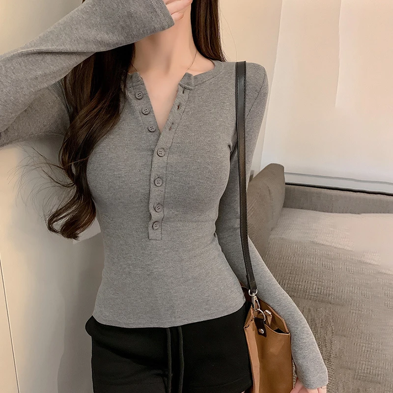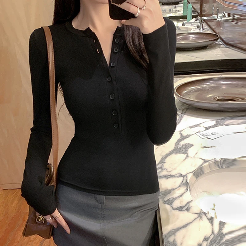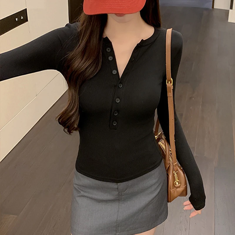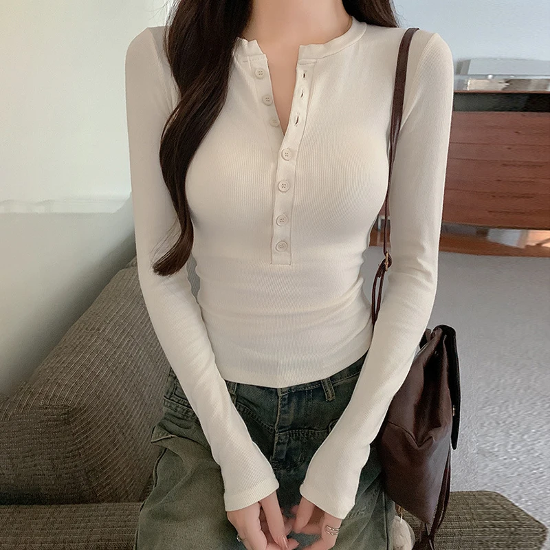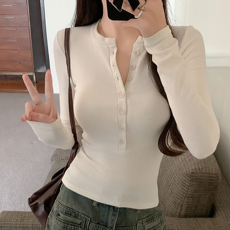 Solid Single Breasted Long Sleeve T-shirt Women Slim Fit Long Sleeve Tops 2025 Autumn Fashion Casual Basic T-shirt